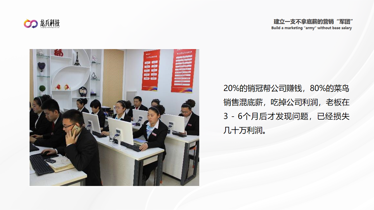 公司养了一堆销售,但是80%的新人销售混底薪,业绩差,甚至0业绩,一个销售摸鱼1个月,就是7500的成本打水漂了,10个销售摸鱼,一个月公司损失7.5万,3个月就损失22.5万的成本。