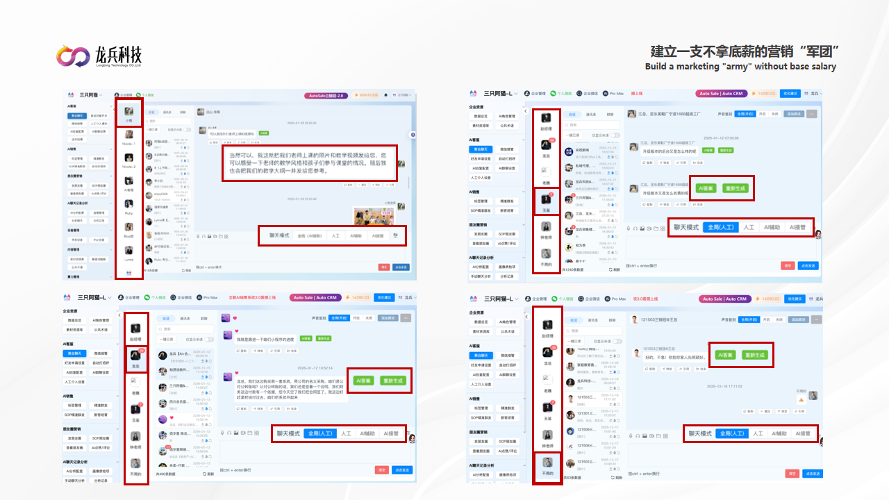 如果是做公司,那么,可以通过一站式AI销售系统,把不出单销售快速干掉,把不跟进客户的销售快速干掉,如果当天就可以监督销售的聊天话术,跟进次数、跟进频率、跟进内容,以及客户反馈,7天就可以评估一个销售的潜力,及时止损。